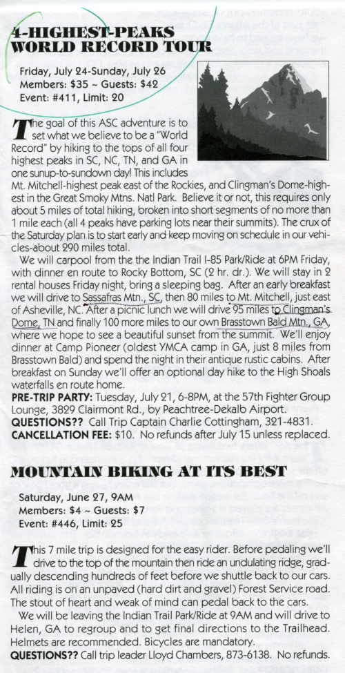 The goal of this adventure is to set what we believe to be a "World Record" by hiking to the tops of all four highest peaks in SC, NC, TN, and GA in one sunup - to - sundown day! This includes Mt. Mitchell - highest peak east of the Rockies, and Clingman's Dome - the highest peak in the Great Smoky Mountains National Park.