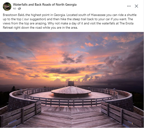 We will carpool from the Indian Trail I-85 park and ride lot at 6pm Friday with dinner en route to Rocky Bottom, SC (2 hr drive). We will stay in 2 rental houses Friday night, bring a sleeping bag. After an early breakfast we will drive to Sassafras Mtn. SC, then 80 miles to Mt. Mitchell, just east of Asheville, NC. After a picnic lunch we will drive 95 miles to Clingmans' Dome, TN and finally 100 more miles to our own Brasstown Bald Mountain GA. where we hope to see a beautiful sunset from the summit. We'll enjoy dinner at Camp Pioneer (oldest YMCA camp in GA, just 8 miles from Brasstown Bald) and spend the night in their antique rustic cabins. After breakfast on Sunday, we'll offer an optional day hike to the High Shoals waterfalls en route home.