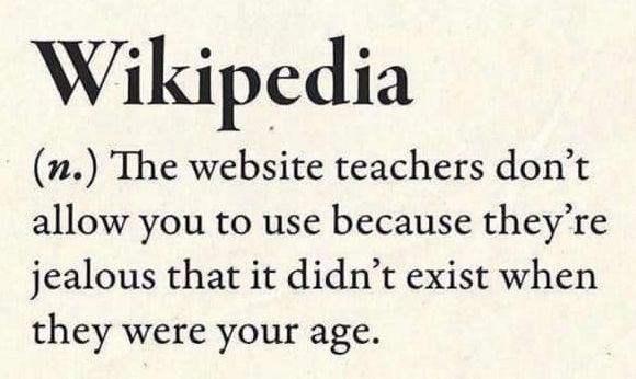 Wikipedia (n.) The website teachers don't allow you to use because they're jealous that it didn't exist when they were your age.